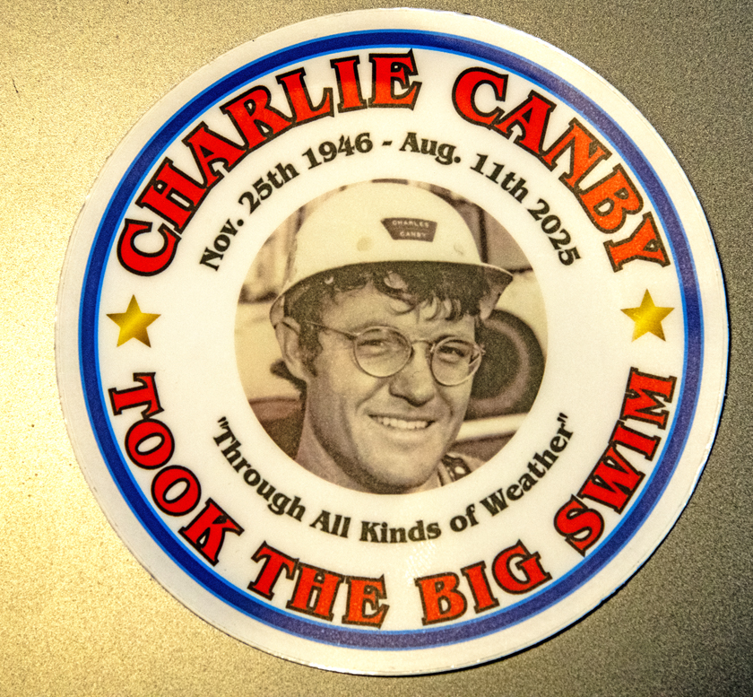Michael Schuck designed and printed stickers which featured Charlie in his 1972 Global Marine helmet. Charlie always said he would “take the big swim” when he passed.