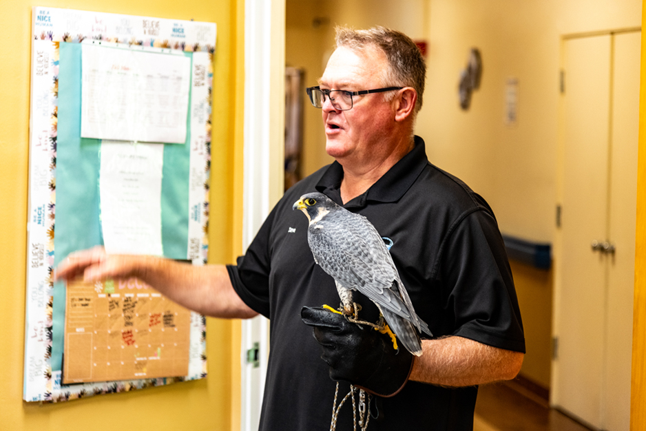 Patients had the rare opportunity to see the birds up close, ask questions, and learn how falconry has been practiced for thousands of years across many cultures. The experience sparked curiosity, conversation, and joy among residents. For some, the visit brought back fond memories; for others, it was their first time seeing a bird of prey at such close range.